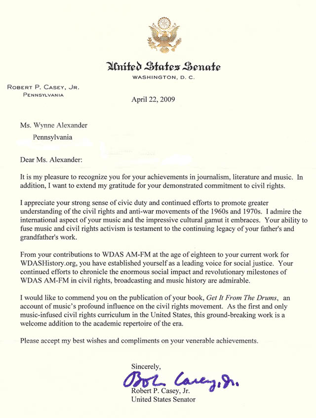 --United States Senator Robert P. Casey, Jr. commending the work of Wynne Alexander